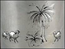 Cocktail mixer, very unusual, with elaborate repoussé design on side. Applied C mono on shoulder. Across the center is a lovely detailed chased and repoussé tableau of sand dunes and three camels centering two palm trees, with two pyramids visible on horizon. On bottom is engraved in script: "Designed and handwrought / for / John W. Campbell / 1922." Hammered and heavy. 8-1/2" H and 6-1/2" W. Marked: STERLING / HAND WROUGHT / AT / THE KALO SHOP / 2 PINTS / CC |