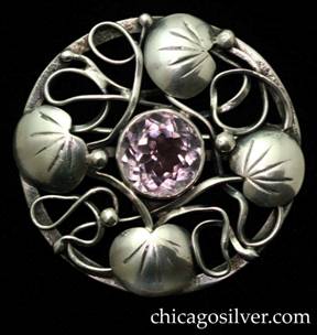 Brooch / pin, round with four large chased lily pads interspersed with four smaller ones, surrounding a central bezel-set round clear cabochon stone, with applied beads and vines on a round frame.