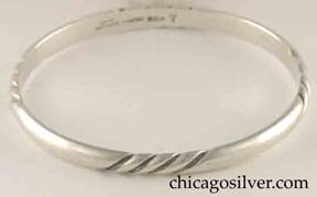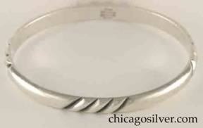 Bracelet, bangle with four repeated design elements of three chased diagonal ribs, engraved "Thelma to Esther August 17, 1940" inside |