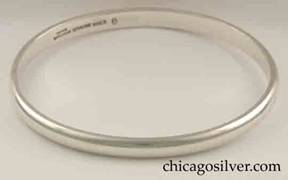 Bracelet, bangle, wide, convex surface with long chased diagonal grooves forming pattern of four diamonds on each side and a silver beads at the side point of each diamond (ten beads total) |