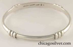 Bracelet, bangle with four repeated design elements of three chased vertical lines forming two bars and surrounding a chased X |