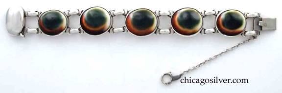 Bracelet, composed of five bezel-set slightly oval links with silver backs, centering domed objects made either of enamel or more likely an exotic shell, each joined with two heavy round silver rings. Links have four loops at the corners for connections, and are convex with green centers on white, edged with speckled brown. Large oval safety clasp and chain. Heavy. |