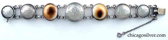 Bracelet, composed of seven round links joined by small silver rings. The center link and four outside links are made of bezel-set 1942 Australian and New Zealand coins, with the largest at center, decreasing is size toward the ends. Coins are: Australia 3-pence 1943, New Zealand 6-pence 1943, Australia shilling 1942, 6-pence 1942, and 3-pence 1911. Surrounding the central coin are two links made of beige bezel-set shells with dark brown centers. Safety clasp and chain. |