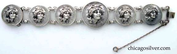 Bracelet, composed of one 1920 half dollar and five 1920 quarters, each with a detailed Greek repousse head adorned with a "LIBERTY" garland made to look as if it is breaking through the metal surface of the coin, with sterling rings linking the coins together. Safety clasp and chain. (See similar coin brooch here.) |