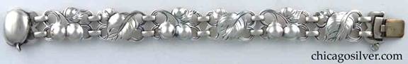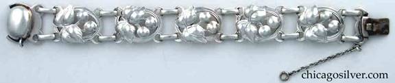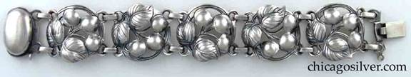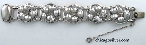 Bracelet, link, with solid oval safety clasp and safety chain, five round links, each containing three chased and repousse cherries and two leaves in round chased cutout frame. Links are each connected with two silver loops. |
