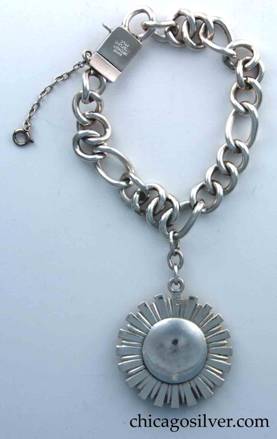 Bracelet, charm, with wide open links of varying sizes and large solid single charm in the form of a two-sided sunburst with a dome at center or a stylized daisy, hanging from smaller chain. Locking box clasp with safety chain. Very heavy. |