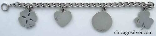 Bracelet, charm, with wide open links holding four cutout charms in the shape of a four-leaf clover, a heart, a circle, and a three-leaf clover. |