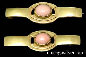 Pins, bar, gold, pair (2), possibly "beauty pins" or "lingerie pins" with coral stones. Rectangular body with straight ends, curving oval center with cutouts on the sides, centering oval bezel-set coral stone on each. Small but lovely. |