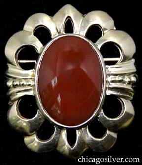 Brooch / pin, gold, very large, with a ring of ten arched and curved loops and a belt of carved beads and lines at the midpoint of both sides, surrounding s very large oval bezel-set red cabochon stone. Very large and heavy. |
