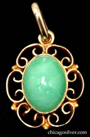 Pendant, gold, oval, small, with six flat gold wires that curve around and under at each end centering a bezel-set green oval cabochon stone. Loop for handing on a chain. Heavy for its size. |