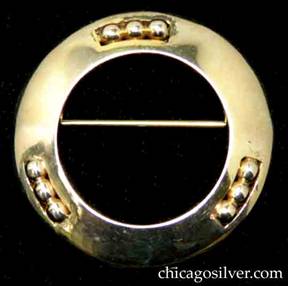 Brooch / pin, gold, circular ring with three repeated design elements of three small balls each |