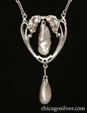 Necklace / pendant, on paperclip chain with two large dangling baroque pearls. Shield shaped frame with pierced geometric details at the bottom and art-nouveau-styled curves with squared-off geometric designs at top. One large oblong freeform baroque pearl with chased silver leaf mount that dangles freely inside the frame, flanked by a chased and hammered applied flower on each side, and another similar pearl with leaf mount that drops from the bottom. Extremely delicate. Early. |