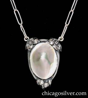 Necklace / pendant, with pearl, on paperclip chain. Oval vertical frame centering large creamy oval bezel-set blister pearl. Applied chased flowers with small beads in the center at each side on the top. Applied curving leaves at the bottom. Chain fastens to small loops beside the flowers in the upper corners. Engraved "Julia / 1920" on the back. |