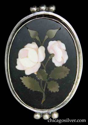 Brooch, oval, with mosaic pietra dura rose motif of two blossoms, four leaves, two rosebuds, and central stem. Large oval frame with three silver beads at the top and bottom. Heavy. For similar piece see Chicago Historical Society: http://www.chicagohs.org/collections/kalo/K5.html |