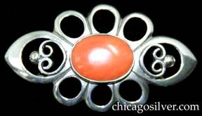 Brooch, oval, with bezel-set oval coral stone at center, three open circles at top and bottom, and pointed ovals at ends with small scrollwork and bead inside each |