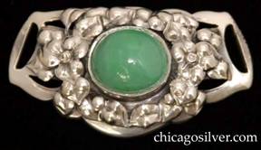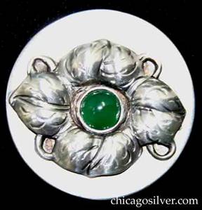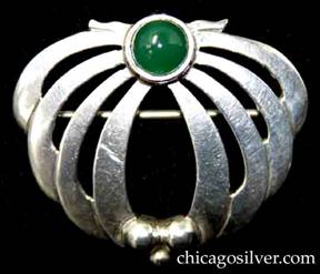 Brooch, oval with four cutout curved overlapping "legs" on each side centering a bezel-set green jade stone, with small beaded decoration at the bottom |