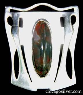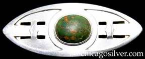 Brooch, oval, with tapering pointed ends, cutout and geometric work on both sides, centering a large green stone with brown streaks, raised rim around the outside and the stone |