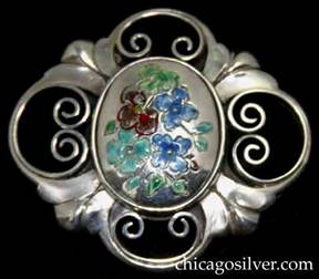 Brooch / pin, with thick spiraling wirework at the top and sides alternating with four stylized flowers that extend over the wirework and join each other, centering chased and enameled flowers in blue, green and red, one with yellow details, on an oval silver center dome |