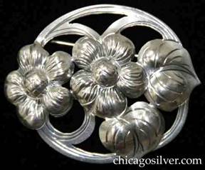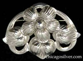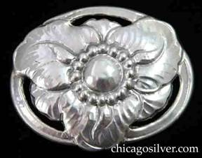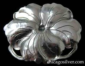 Brooch, in the shape of a camellia flower, with small recessed center, five large chased petals, two small chased cutouts at bottom. Heavy. |