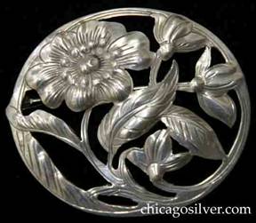 Brooch / pin, chased and repousse blossom at top with five petals and round cross-hatched center, and three pointed leaves at bottom, on cutout oval heart-shaped frame. |