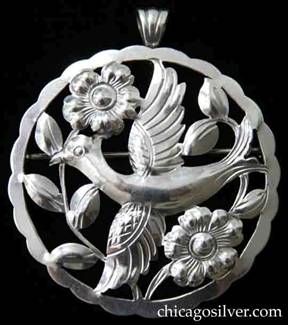 Brooch / pendant, large, round, with scalloped outside edge and chased, cutout, and repousse form of bird with outstretched wings and swallow tail, surrounded by round blossoms and leaves on stems. Hinged bale in back for use as pendant. Unusual and lovely form. |