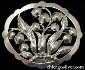 Brooch with cutout lily-of-the-valley pattern over arch of small dots and chased geometric design, inside oval frame |