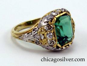 Ring, handwrought in 14K yellow gold with green tourmaline and four small diamonds. 14K gold shank and setting with central square green tourmaline flanked on all sides with elaborate and finely detailed 14K white gold leaves, beads and scrolls with four small faceted diamonds, one on each side. |