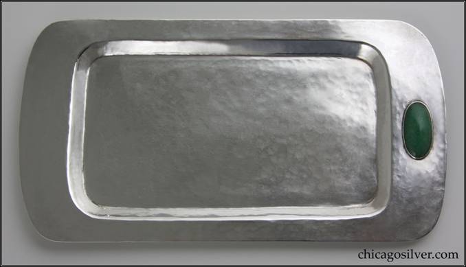 Tray with stone, early. Rectangular form with recessed rectangular center and raised edge that is wide and curved at the ends. On the edge of one end is a large oval bezel-set dark green cabochon stone. Nice hammering. 8-7/8" L and 4-3/4" W. Marked: STERLING / KALO